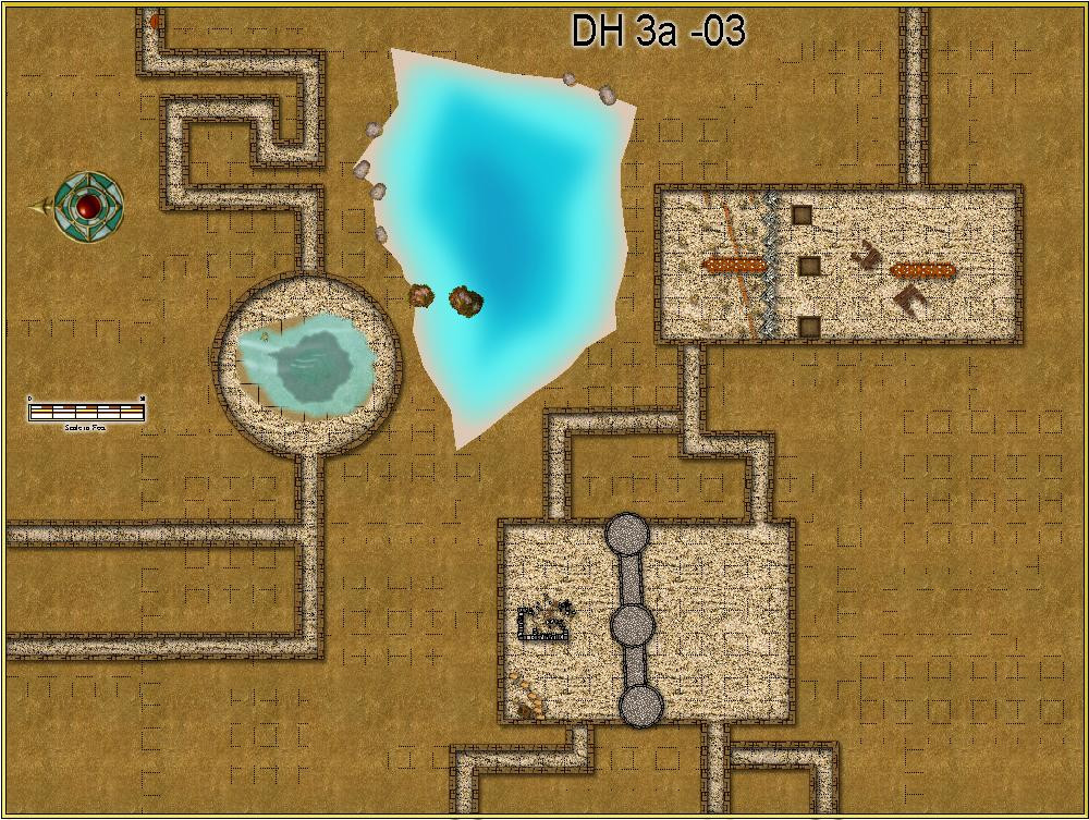 22 ) a circle room. Debris blocks a smooth walk around the water. Can the shark in room 21 get over here ? A secret door leads to mold floored passageways and rooms.